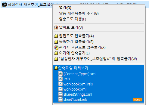 위의 파일이 xlsx 된 파일이고 이 파일의 확장명을 zip으로 강제 변경한다.