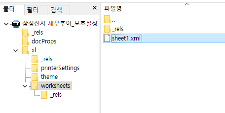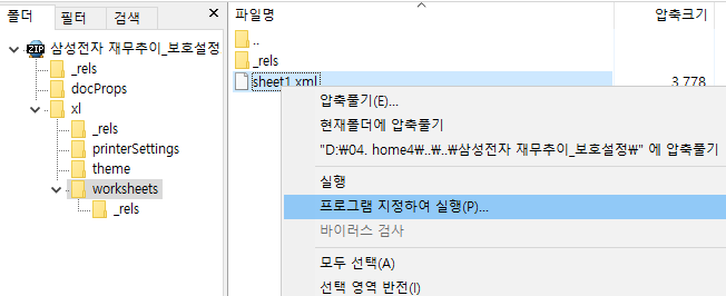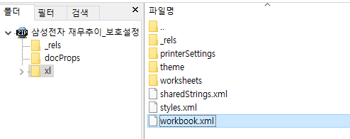 방법은 시트 보호를 해제 하는 경우와 동일하다. 다만 수정할 xml 파일이 다를 뿐이다. (그림 4 참조)