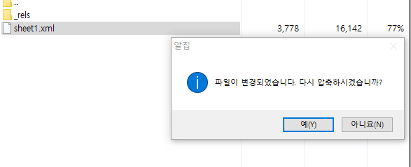 노트패드에서 저장 후에 노트패드를 닫어면 아래와 같이 압축할 것인지 묻는다. 그럼 예(Y)를 눌러 다시 압축한다.
